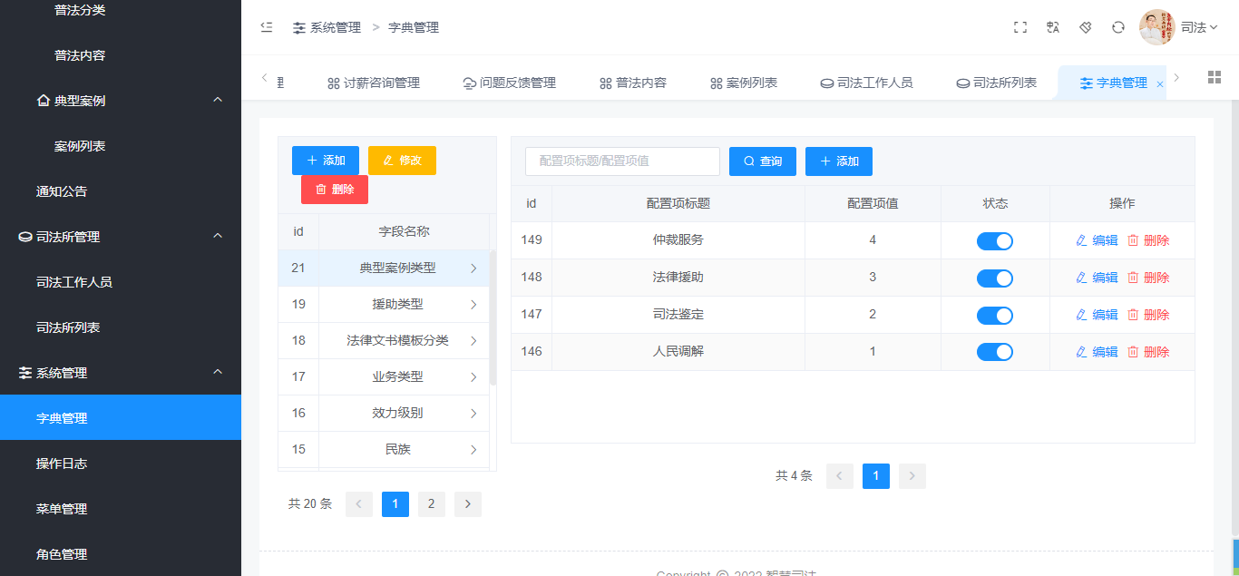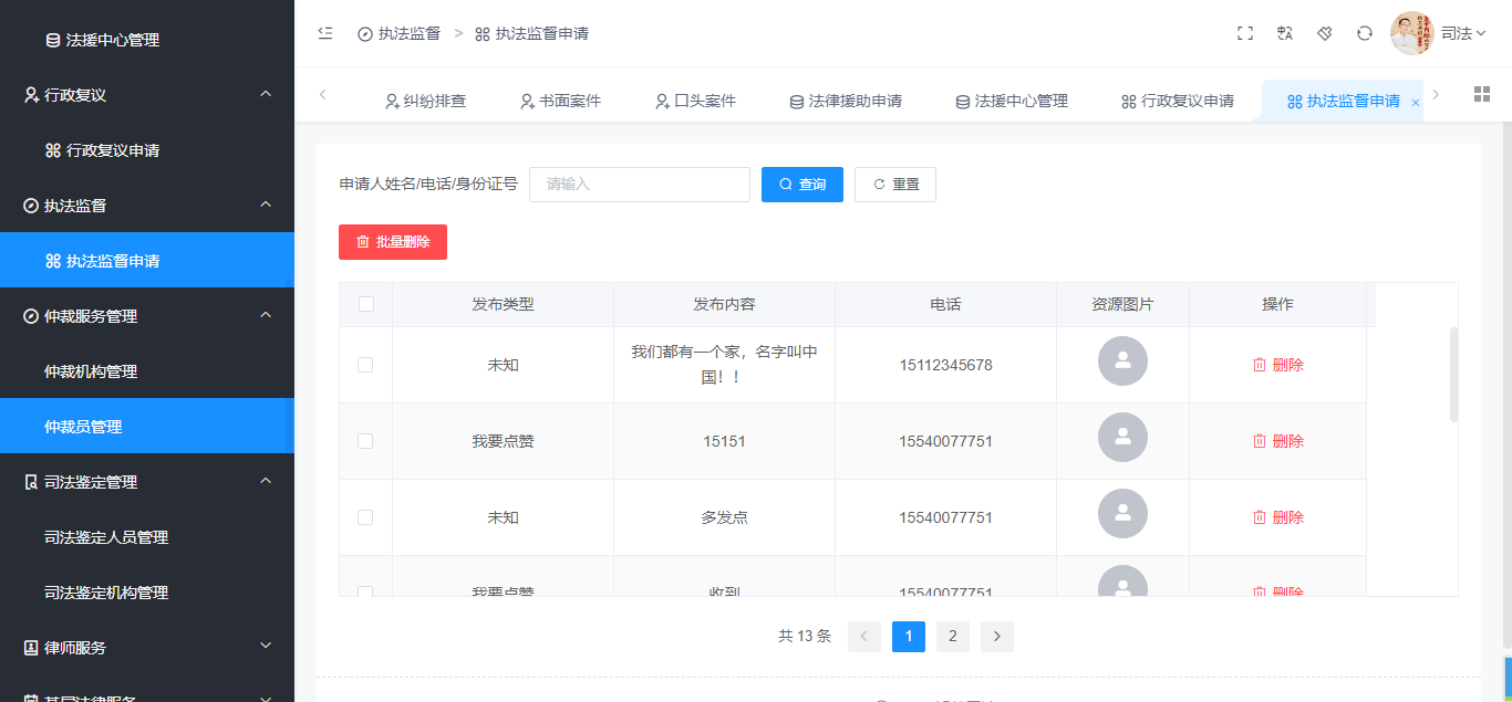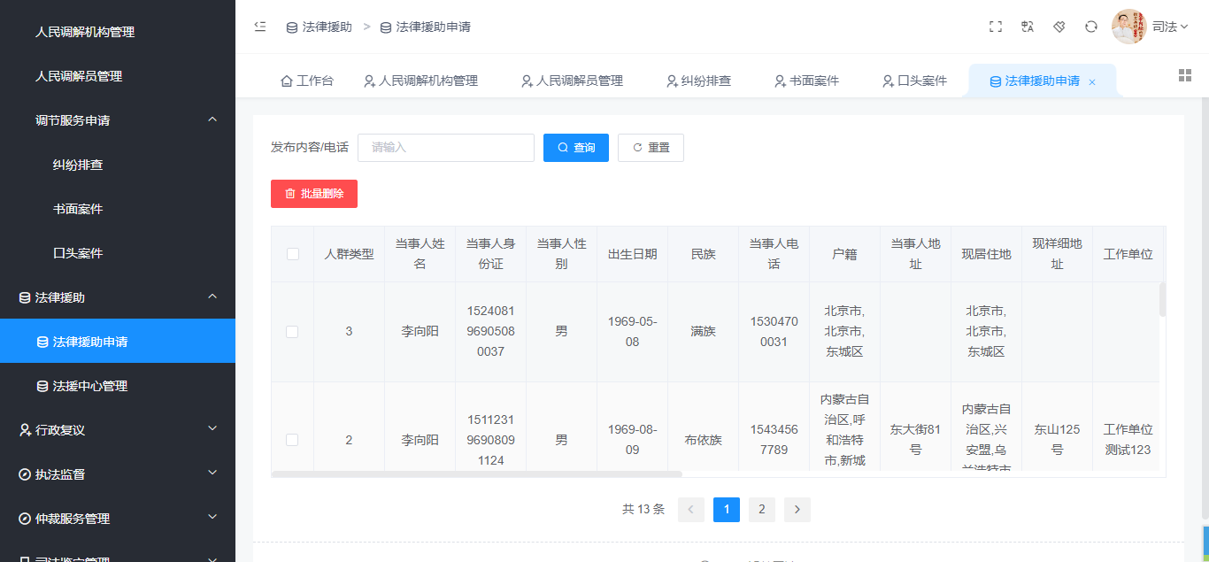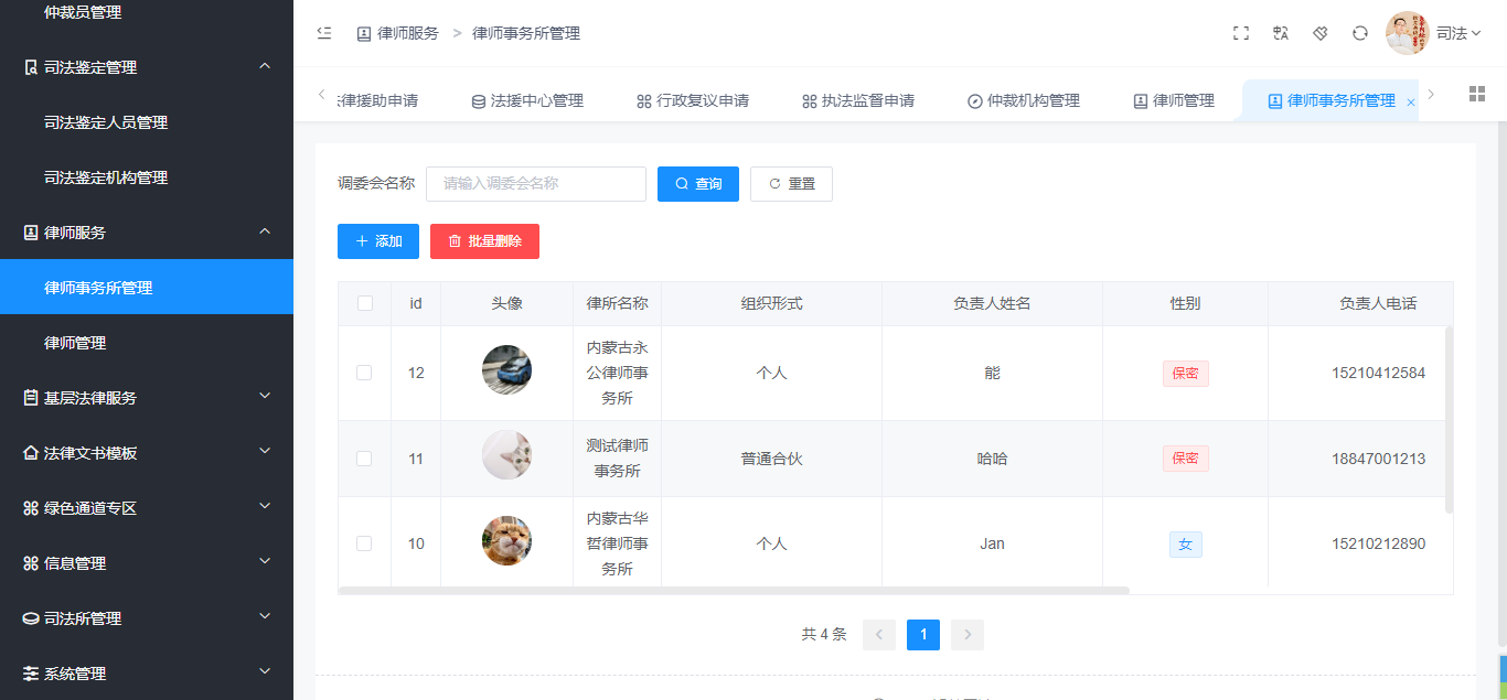 2、构建公共法律服务网,社会大众可以通过用户平台进行法律咨询,各法律服务机构相关资质信息的查询,相关法律服务的申办,如:法律公证,法律援助,人民调解,司法鉴定,仲裁服务等。服务进度的跟踪查询,用户可以查询发起的法律服务诉求,包含:法律咨询的回复,法律服务的申办进度。服务结果的评价机制,用户可以对已经结束的法律服务机构或工作人员进行评价,评价信息将公开。