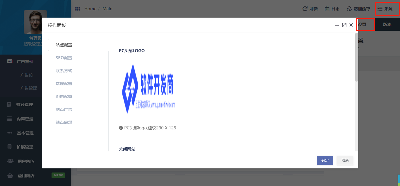 2、系统设置,SEO设置/开关设置/模板设置/邮件设置等