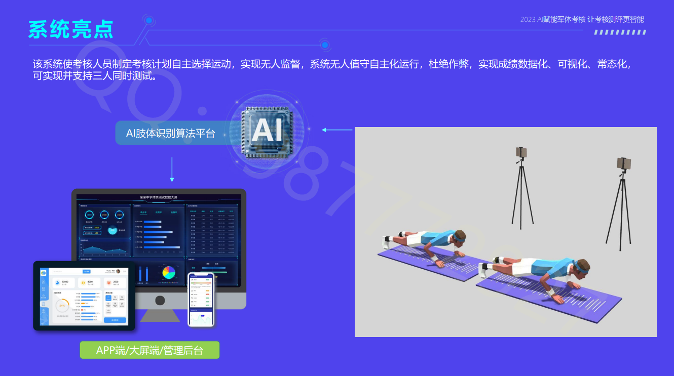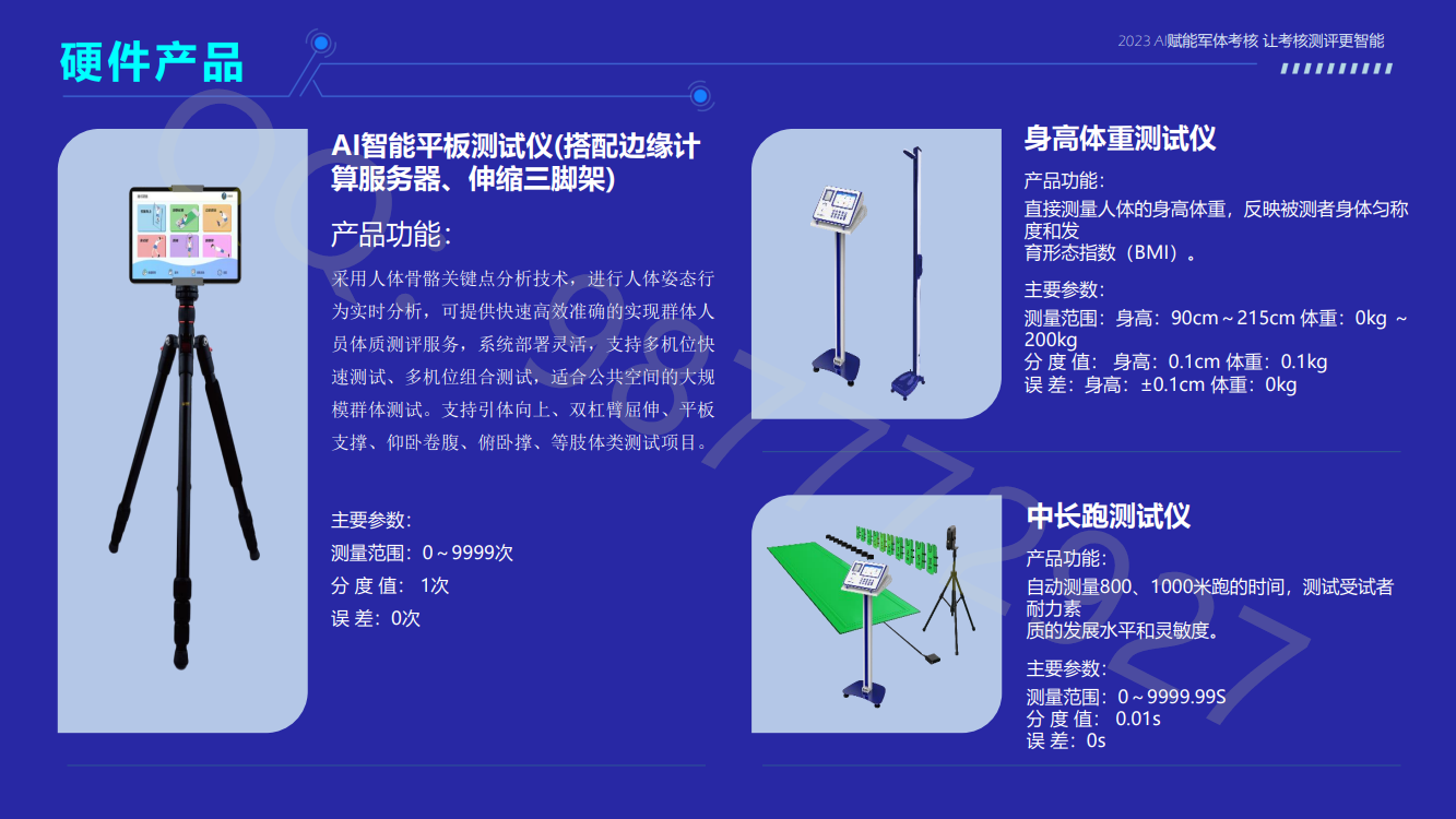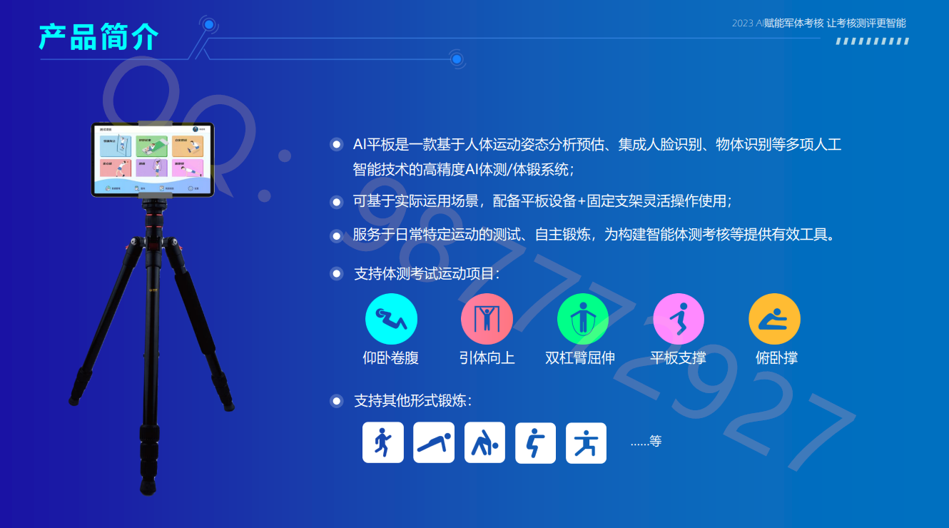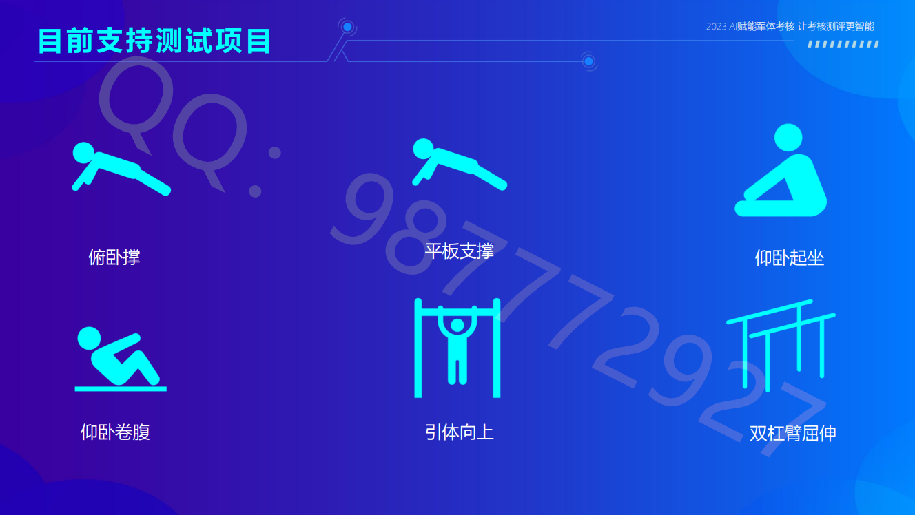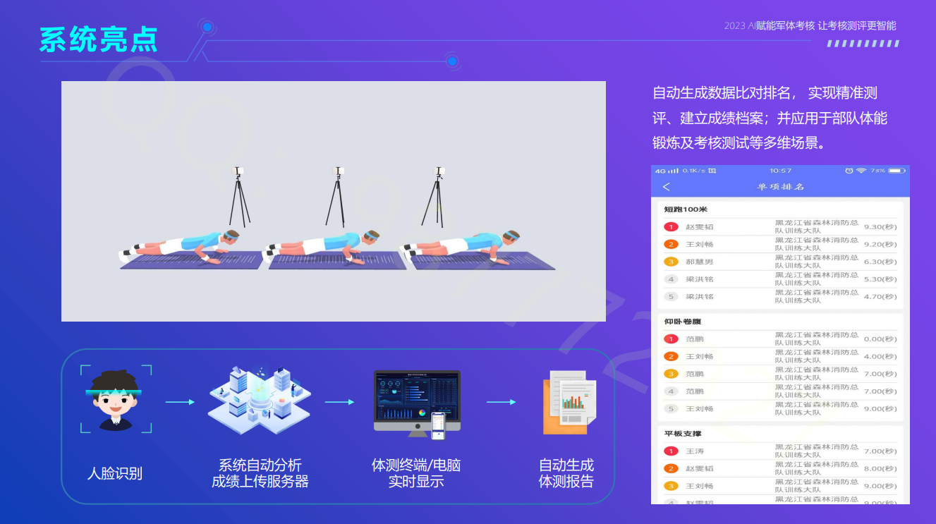 设备采用人体骨骼关键点分析技术,进行人体姿态行为实时分析,动作捕捉、视觉SLAM、智能物联,可提供快速高效准确的实现群体人员体质测评服务,系统部署灵活,支持多机位快速测试、多机位组合测试,适合公共空间的大规模群体测试。支持引体向上、双杠臂屈伸、平板支撑、仰卧卷腹、俯卧撑、立定跳远、50米跑等不少于8项测试项目。