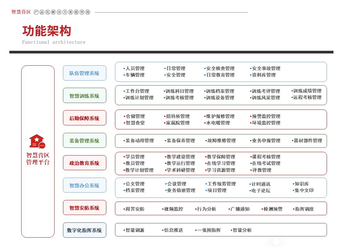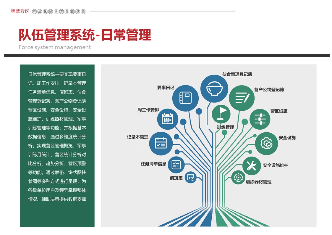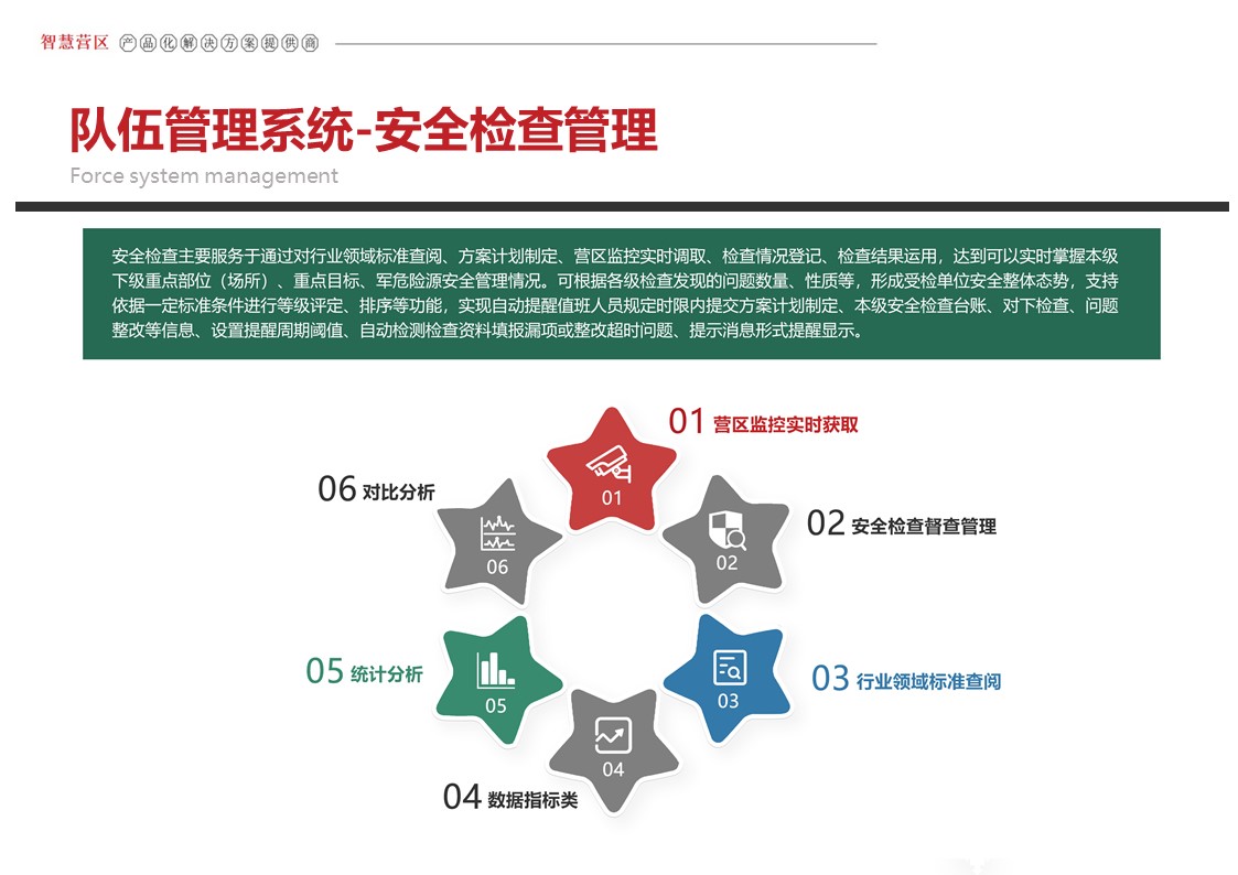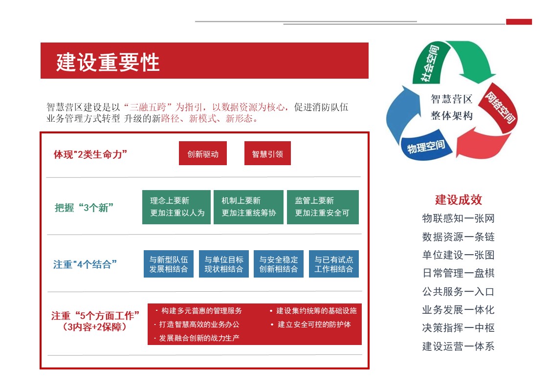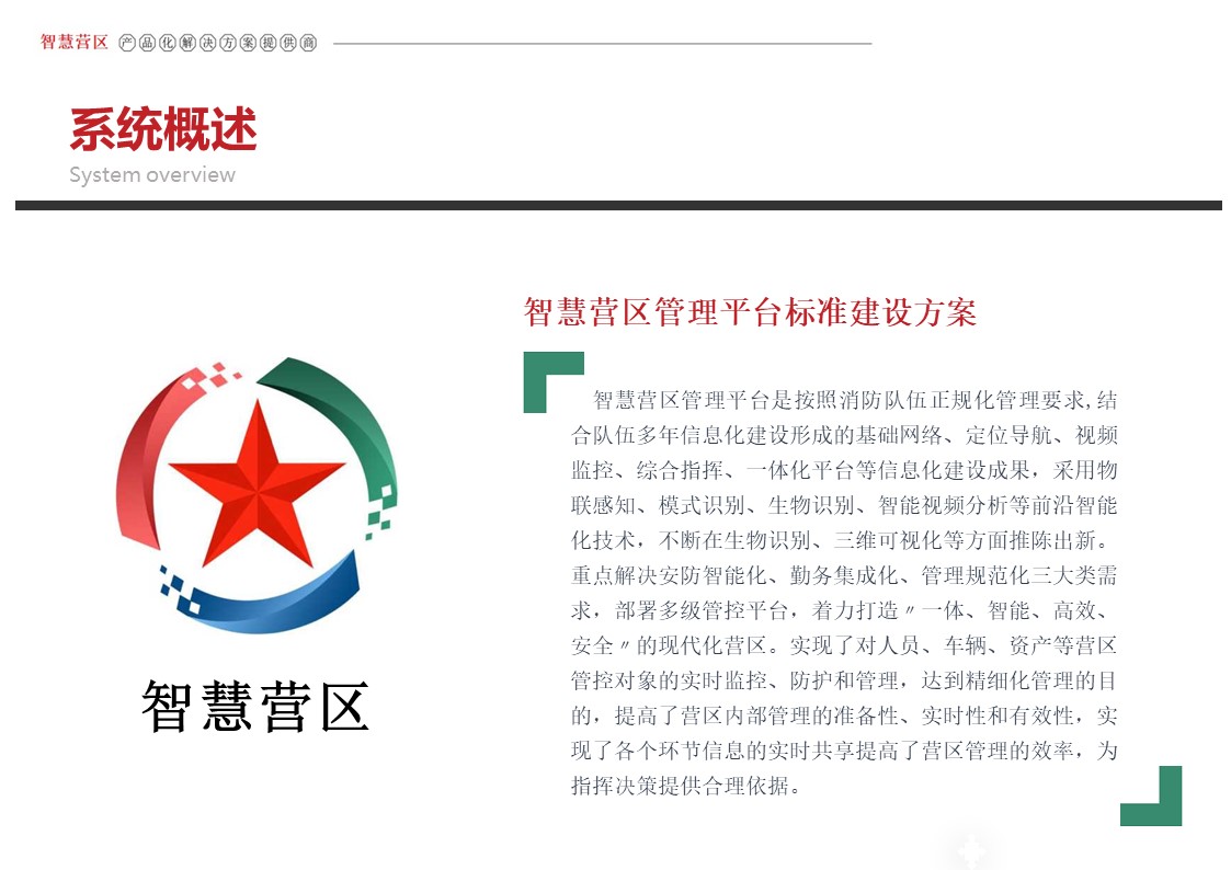 智慧营区管理平台是按照消防队伍正规化管理要求,结合队伍多年信息化建设形成的基础网络、定位导航、视频监控、综合指挥、一体化平台等信息化建设成果,采用物联感知、模式识别、生物识别、智能视频分析等前沿智能化技术,不断在生物识别、三维可视化等方面推陈出新。重点解决安防智能化、勤务集成化、管理规范化三大类需求,部署多级管控平台,着力打造〃一体、智能、高效、安全〃的现代化营区。实现了对人员、车辆、资产等营区管控对象的实时监控、防护和管理,达到精细化管理的目的,提高了营区内部管理的准备性、实时性和有效性,实现了各个环节信息的实时共享提高了营区管理的效率,为指挥决策提供合理依据。