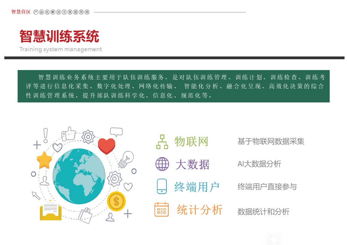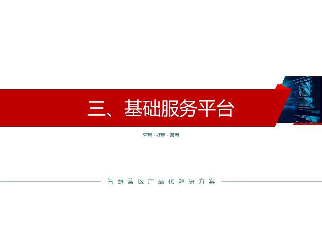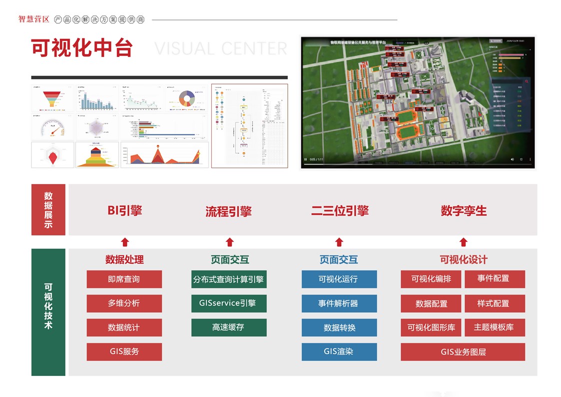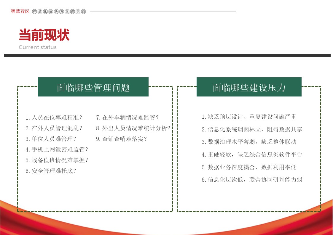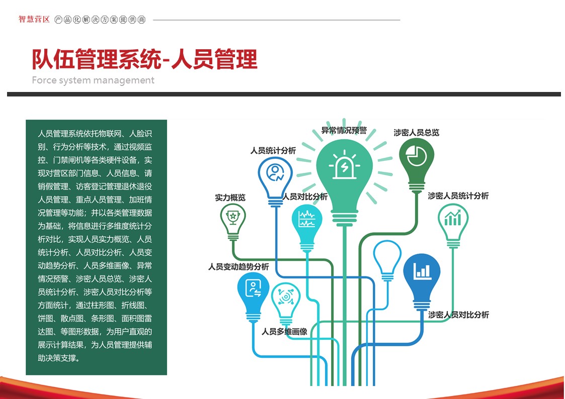 智慧营区管理平台是按照消防队伍正规化管理要求,结合队伍多年信息化建设形成的基础网络、定位导航、视频监控、综合指挥、一体化平台等信息化建设成果,采用物联感知、模式识别、生物识别、智能视频分析等前沿智能化技术,不断在生物识别、三维可视化等方面推陈出新。重点解决安防智能化、勤务集成化、管理规范化三大类需求,部署多级管控平台,着力打造〃一体、智能、高效、安全〃的现代化营区。实现了对人员、车辆、资产等营区管控对象的实时监控、防护和管理,达到精细化管理的目的,提高了营区内部管理的准备性、实时性和有效性,实现了各个环节信息的实时共享提高了营区管理的效率,为指挥决策提供合理依据。