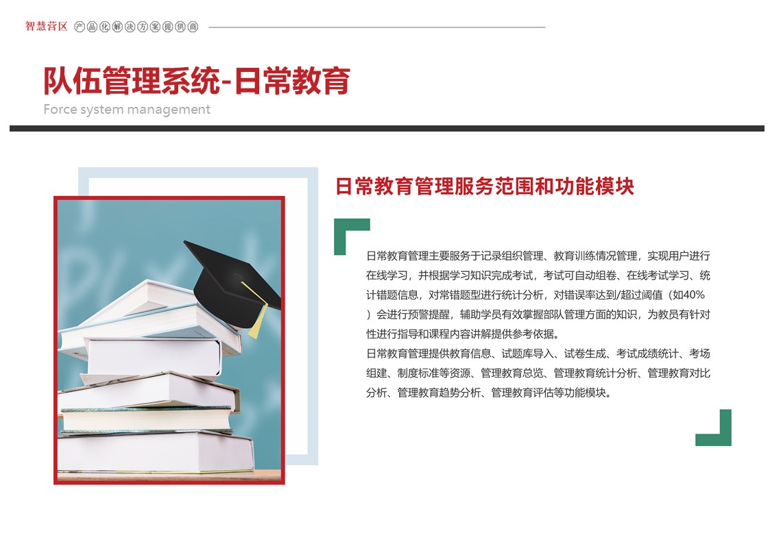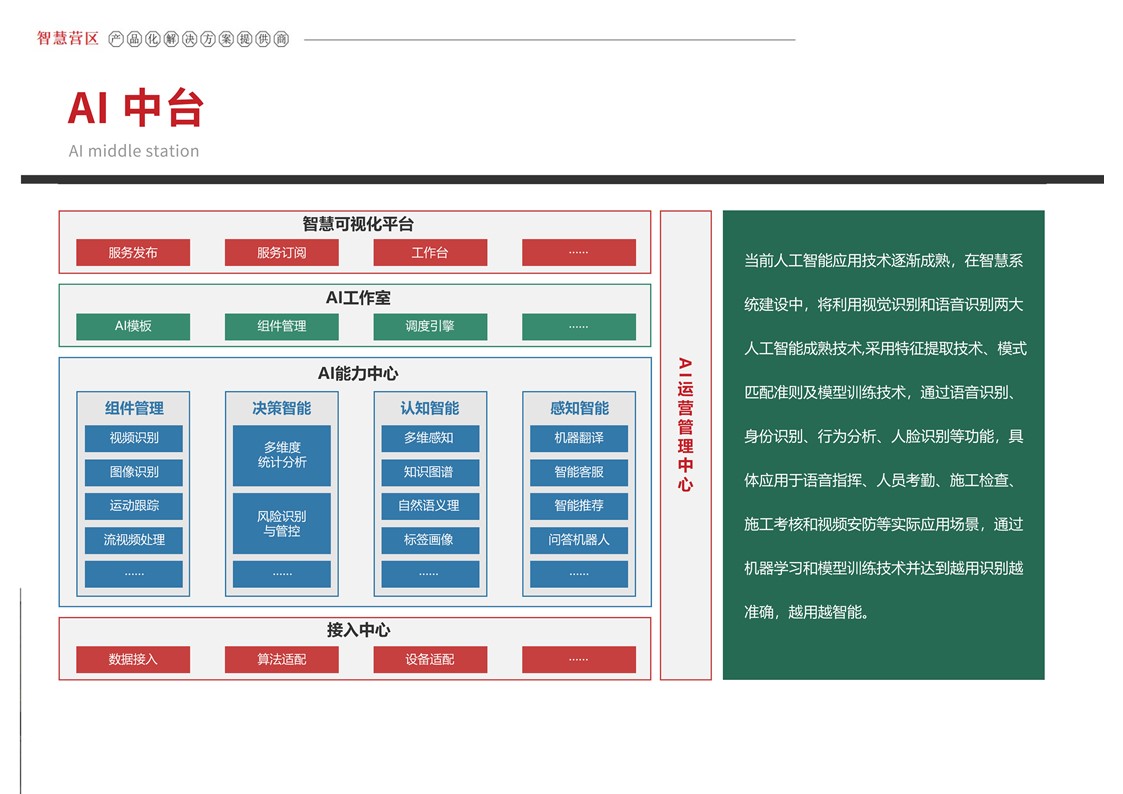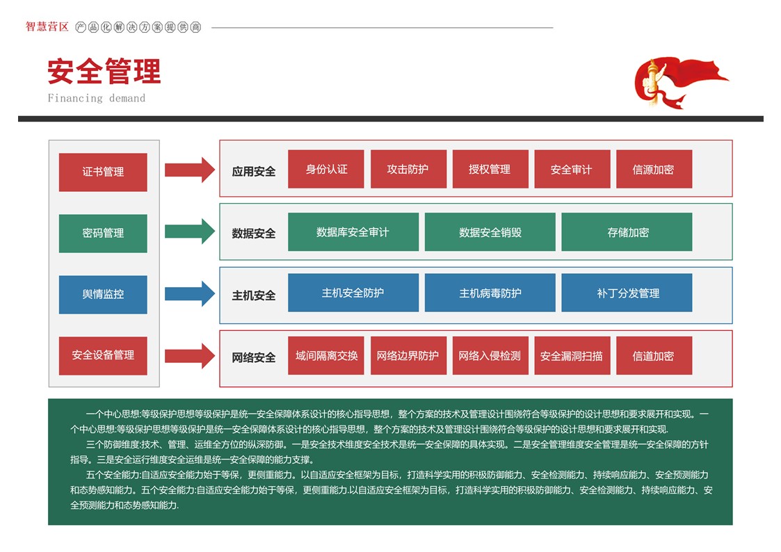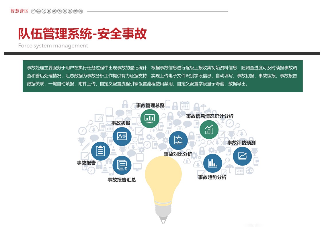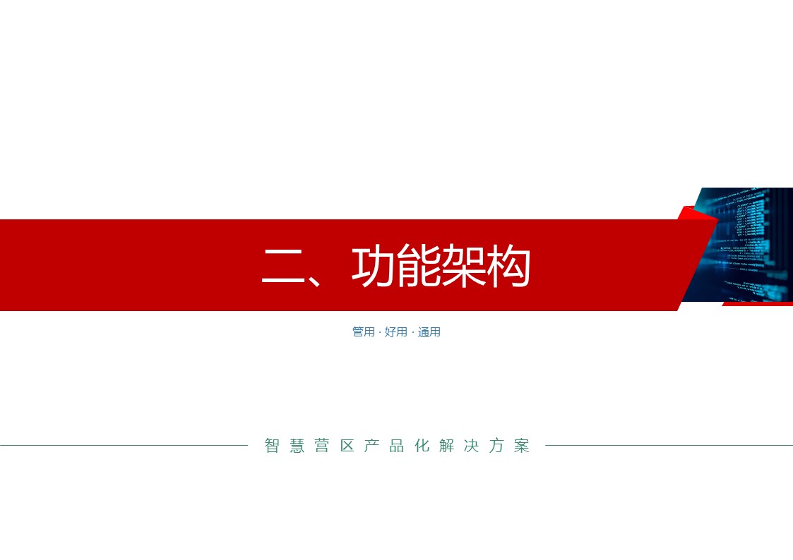 智慧营区管理平台是按照消防队伍正规化管理要求,结合队伍多年信息化建设形成的基础网络、定位导航、视频监控、综合指挥、一体化平台等信息化建设成果,采用物联感知、模式识别、生物识别、智能视频分析等前沿智能化技术,不断在生物识别、三维可视化等方面推陈出新。重点解决安防智能化、勤务集成化、管理规范化三大类需求,部署多级管控平台,着力打造〃一体、智能、高效、安全〃的现代化营区。实现了对人员、车辆、资产等营区管控对象的实时监控、防护和管理,达到精细化管理的目的,提高了营区内部管理的准备性、实时性和有效性,实现了各个环节信息的实时共享提高了营区管理的效率,为指挥决策提供合理依据。